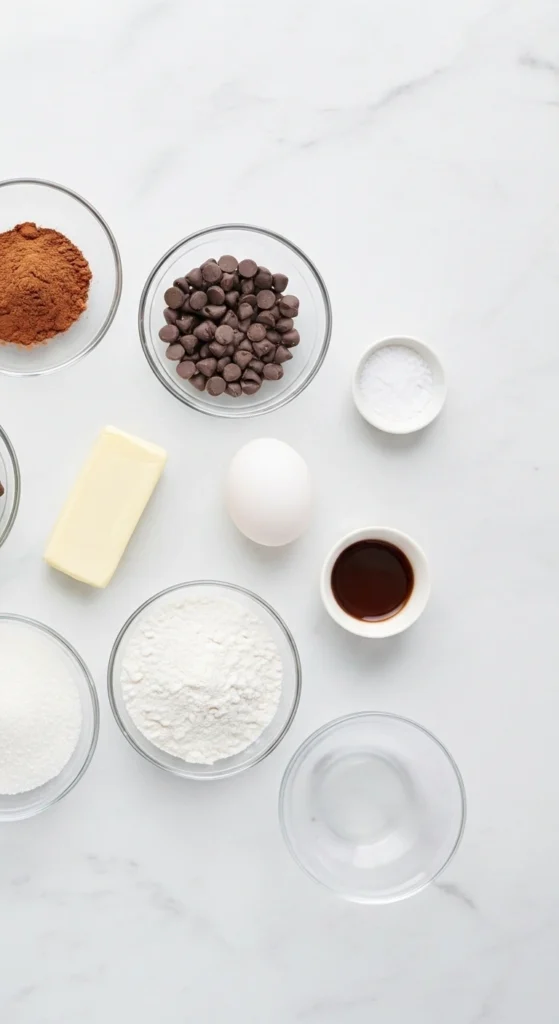 Pour un gâteau au chocolat au micro-ondes, il vous faut : beurre, farine, sucre, cacao non sucré, œuf, levure chimique, eau et extrait de vanille. Les pépites de chocolat sont optionnelles mais recommandées pour plus de gourmandise.