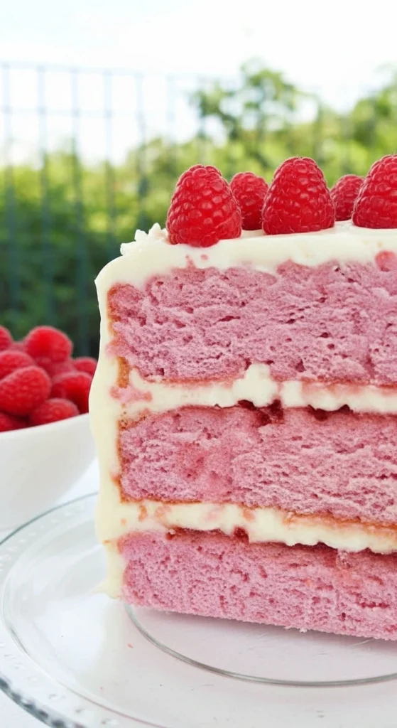 Un appétissant gateau aux framboises à trois étages, garni de framboises fraîches et d'un glaçage crémeux blanc, est présenté sur un élégant présentoir à gâteau rose. Une part a été découpée, révélant la texture moelleuse de la génoise rose et des couches de crème. Deux bols remplis de framboises éclatantes complètent la composition, le tout sur fond de verdure luxuriante.