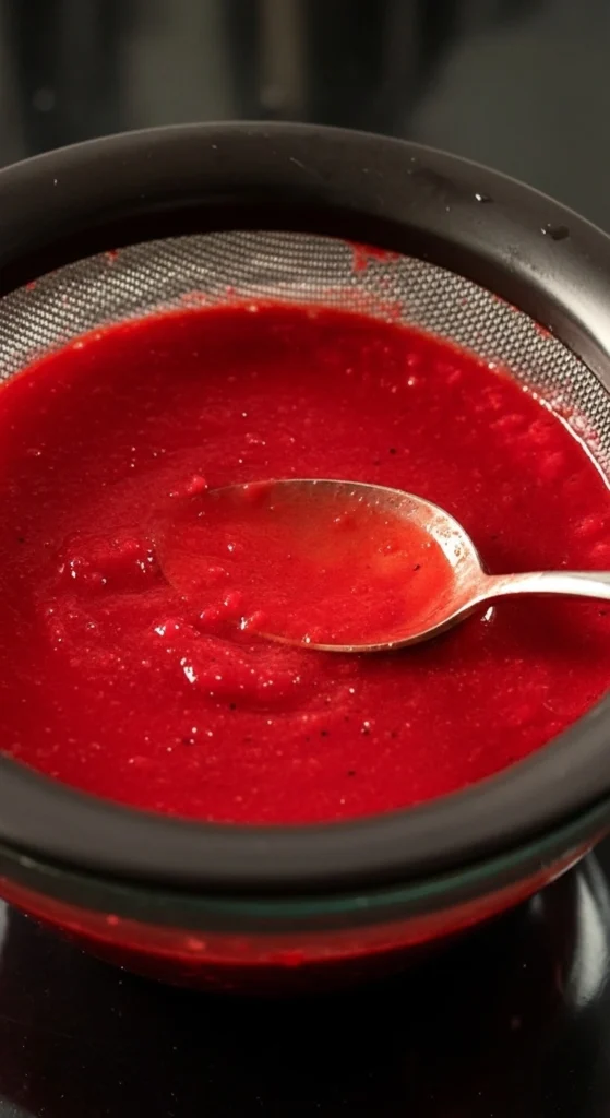 • Versez les framboises décongelées dans un blender et mixez. Placez un tamis fin au-dessus d’un bol et versez-y la purée. À l’aide du dos d’une cuillère, pressez la purée à travers le tamis pour retirer les graines — cette étape prend quelques minutes. Pensez à racler la pulpe collée sous le tamis. Jetez les graines et résidus restants. Vous devriez obtenir environ 180 ml (¾ tasse) de purée filtrée. Ajoutez de l’eau pour atteindre 300 ml (1 ¼ tasse).