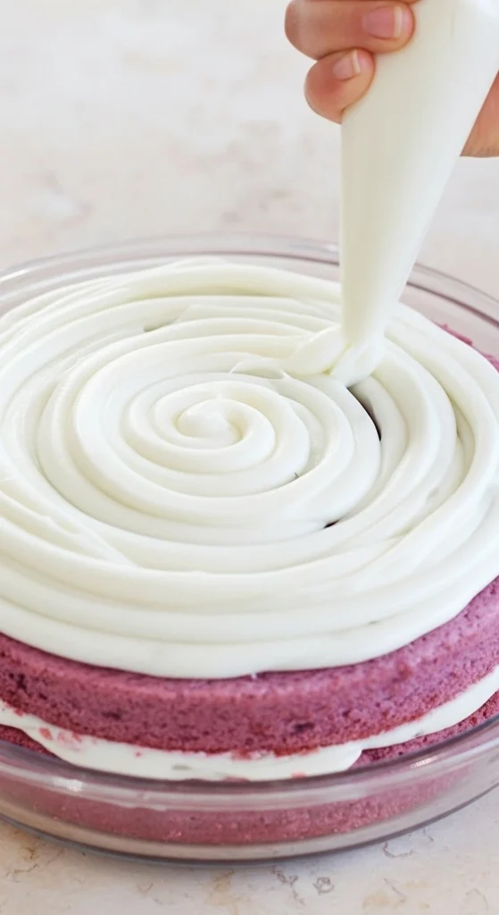 • Pochez ensuite une couche de glaçage au cream cheese par-dessus la garniture.