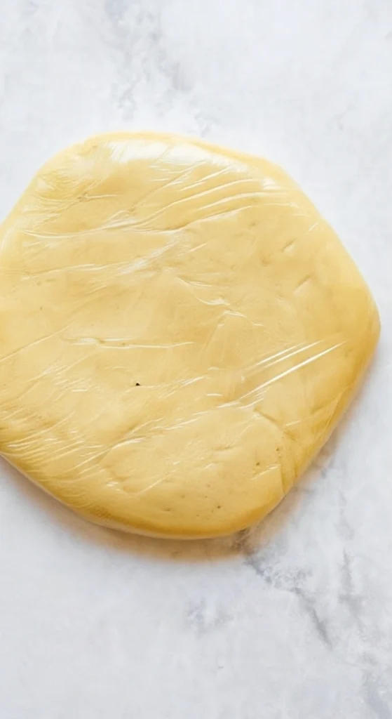 • Transférez la pâte sur une feuille de papier cuisson légèrement farinée et rassemblez-la en boule. La pâte sera très souple et collante, mais évitez d’ajouter de la farine. Divisez-la en deux. En travaillant une moitié à la fois, étalez-la entre deux feuilles de papier cuisson sur environ 5–6 mm d’épaisseur pour former un disque légèrement plus grand que 20 cm. Répétez avec l’autre moitié et placez les deux disques au réfrigérateur entre leurs feuilles de papier cuisson pendant au moins 3 heures pour qu’ils refroidissent complètement.