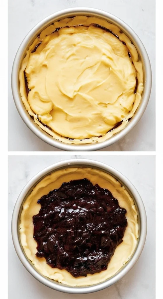 Garniture : Traditionnellement, ce gâteau est rempli soit de crème pâtissière, soit de confiture de cerises noires, et non d’une combinaison des deux (même si je trouve que ce serait délicieux). Vous pouvez cependant utiliser la confiture de votre choix, comme framboise, prune, curd de citron ou marmelade d’orange. Je pense que ce serait également délicieux avec un disque de pâte d’amande étalée pour recouvrir le fond avant d’ajouter la couche de confiture.