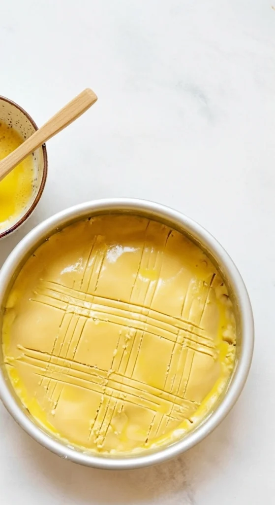 • Battez l’œuf restant avec 1 cuillère à café d’eau froide pour réaliser une dorure. Badigeonnez le dessus du gâteau avec la dorure à l’aide d’un pinceau. Tracez un motif quadrillé sur la pâte à l’aide des dents d’une fourchette. Dorure