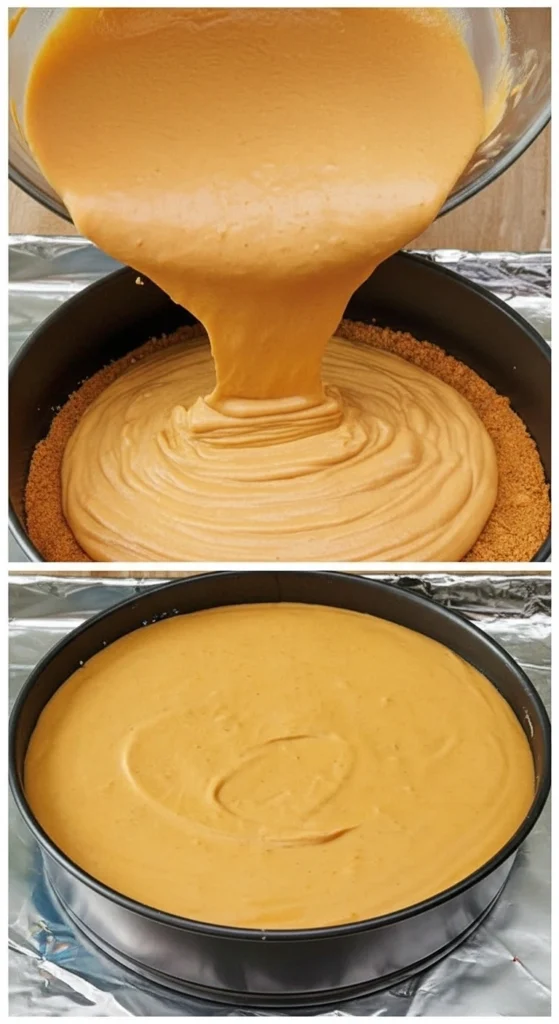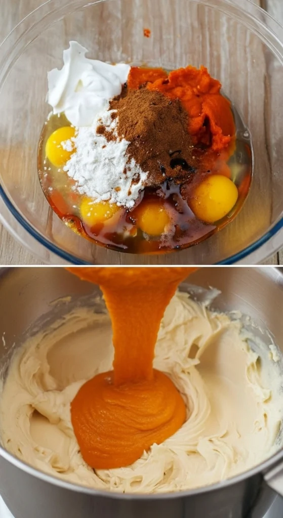 • Mélanger la citrouille – Dans un autre bol, fouettez la purée de citrouille, les œufs, la crème aigre, la farine, les épices pour tarte à la citrouille, le sel et l’extrait de vanille jusqu’à obtenir un mélange homogène. Incorporez ce mélange au cream cheese à faible vitesse juste jusqu’à ce que ce soit bien combiné, en raclant le bol au besoin.