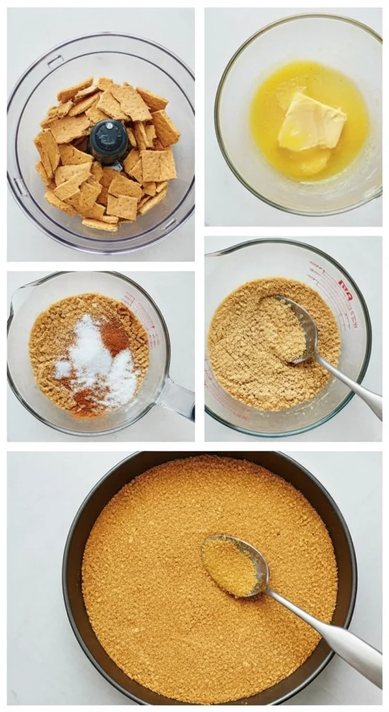 • Préparation – Préchauffez le four à 180 °C. Mixez les biscuits Graham dans un robot culinaire jusqu’à obtenir des miettes fines.
