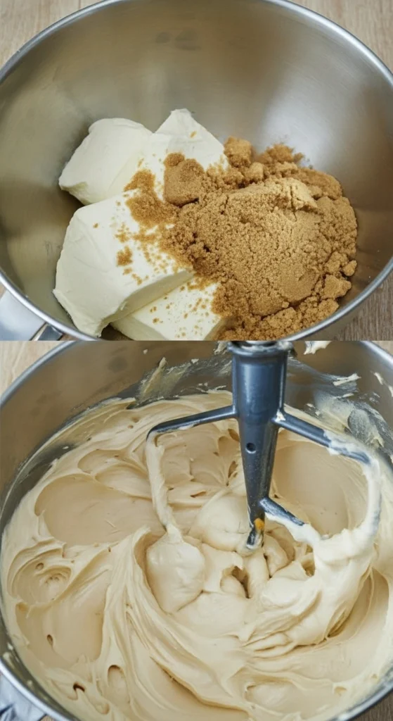 • Battre le cream cheese – Préchauffez le four à 165 °C. Dans le bol de votre batteur muni de la palette, battez le cream cheese ramolli et la cassonade à vitesse moyenne pendant 5 minutes jusqu’à obtenir une texture légère et mousseuse, sans grumeaux. Raclez le bol une fois pour vous assurer qu’il ne reste pas de morceaux de cream cheese.
